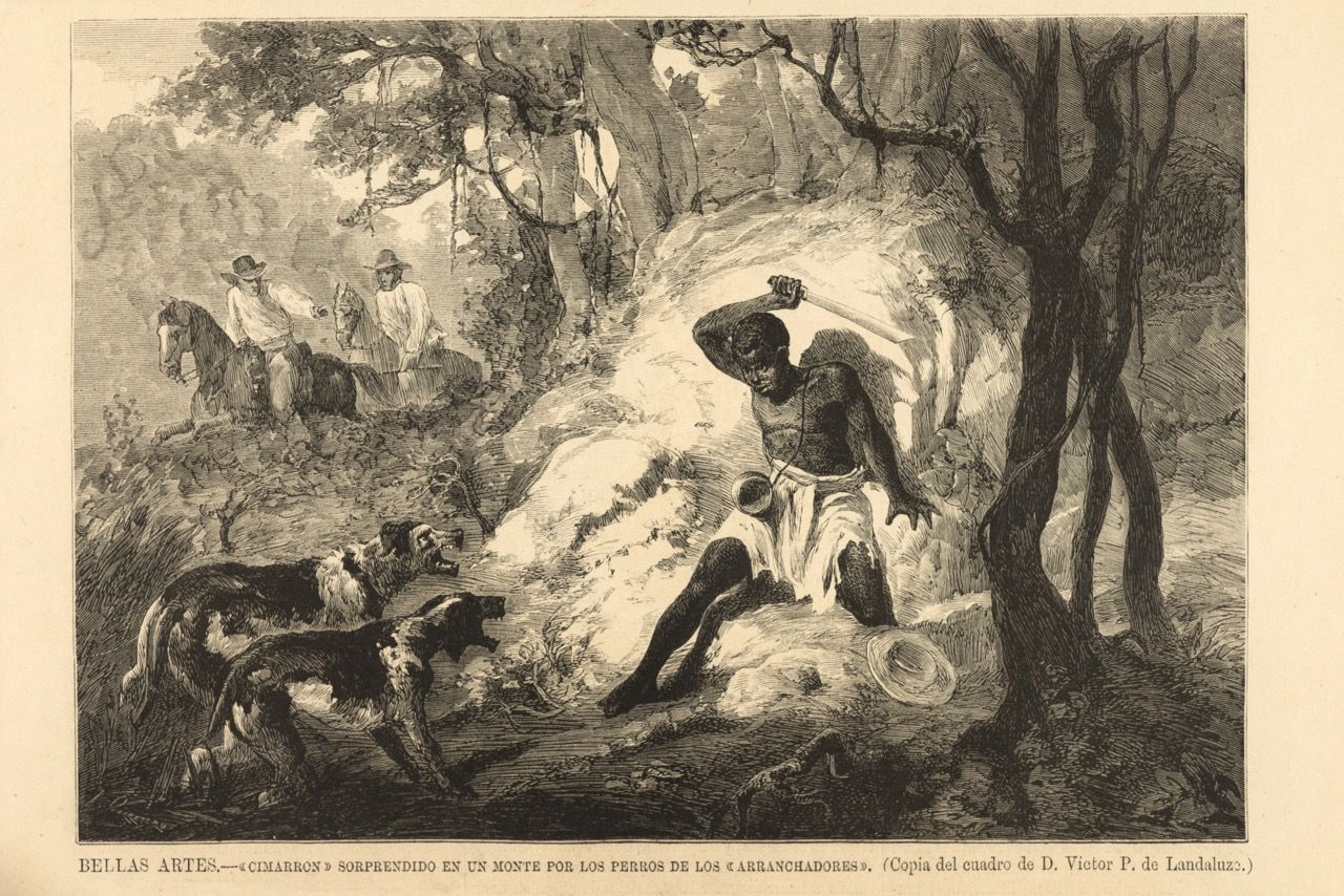 2. Cimarró sorprès en un bosc pels gossos dels "Arranchadors". Còpia del quadre de Víctor Patricio Landaluze. Col·lecció Museu Marítim de Barcelona.