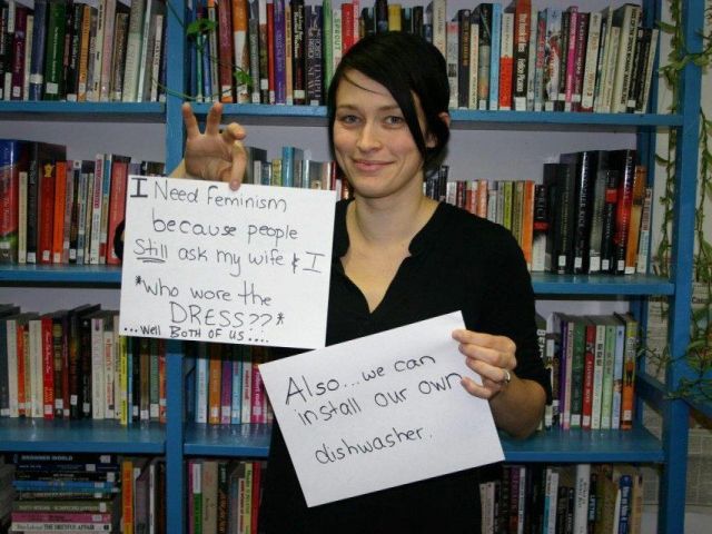 11. Necessito el feminisme perquè encara hi ha gent que pregunta a la meva dona i a mi: "Quina porta el vestit?" Bé, les dues... També podem instal·lar els nostres rentaplats.