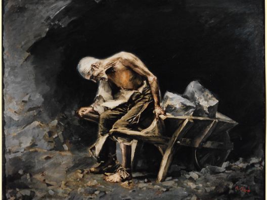 Mentre miro El peó, recordo la primera visita que vaig fer a l’exposició, quan vaig quedar atrapada en l’esbós de l’Èxtasi de sant Francesc d'Assís, capaç de reproduir a raig fet tanta mística religiosa en sols tres traços assertius. Ara, en canvi, davant la figura d’un vell miner que estira una carreta fora de la galeria, comparteixo amb la resta dels assistents l’esbalaïment davant un dolor que poc té a veure amb la fe, la penitència o l’èxtasi. Més aviat es tracta de la conseqüència crua i nua d’un determinisme de classe que administra cossos, subjugant-ne d’uns i alliberant-ne d’altres, gastant-los la pell, exhaurint-los. La figura alienada del quadre no té carn, amb prou feines conserva l’espinada, i tan sols transmet el patiment del qui escura el no-res.