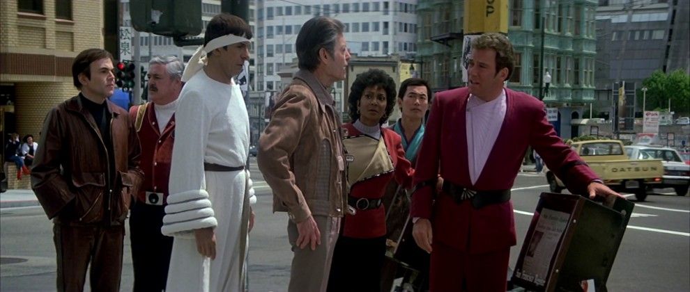 És obvi que Star Trek va superar el cop i els anys 80 són plens de seqüeles amb alts i baixos importants. I un dels baixos va ser, sense cap mena de dubte, Star Trek IV: The Voyage Home. En aquell moment, algú havia decidit que Leonard Nimoy i William Shatner podien escriure i dirigir les pel·lícules que anaven fent. No és difícil imaginar una calçotada trekkie on, entre ampolla de vi i ampolla de vi anaven apuntant idees descabellades per a noves seqüeles vuitanteres. Vist d’aquesta manera, encara tenim sort de que només n’haguessin fet sis abans de canviar als protagonistes de la nova generació, però tot i això una d’aquelles idees descabellades va passar el filtre i algú va decidir que, sense pressupost i sense unes intencions gaire clares, la troupe podia anar al San Francisco dels anys 80 per salvar les balenes. I de retruc, la humanitat. Si a això afegim que la nau que utilitzen es pot fer invisible, el resultat és que a Star Trek IV pràcticament no van haver de pensar en cap decorat. Ni en efectes especials. Ni en hòsties d’aquestes típiques d’Star Trek, precisament. De fet, per no haver de pensar en res fins i tot van posar una cinta al cap d’en Leonard Nimoy per no haver-li de col·locar les pròtesis a les orelles.