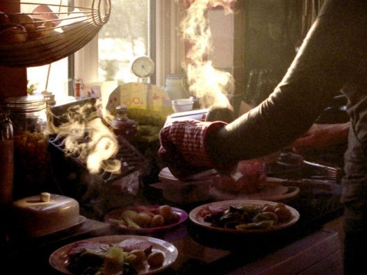 La mare als fogons i jo un esquitx al llindar de la porta que donava al safareig, el lloc segur on, em deien els avis xilens, podies salvar-te de tots els terratrèmols. La mare als fogons dient-me "Cuéntame cosas" i jo al llindar sense haver de pidolar atenció i amor, sense haver de ser algú que no era. I de fons, ves a saber per què, Me llaman Calle, que és els germans i és la mare i l'àvia cuinant empanades, i la cuina de casa els pares és ara el menjador d'una casa de bruixes adorables, amables i besables que ballen amb la vida al centre i em porten versos que parlen de mi i parlen de totes (Cómo calzarse / la palabra mujer / sin que el pie zancajee / dentro del zapatito), i les mares ballen al voltant nostre encara que no ho diguem, encara que no les diguem. I jo, que enyoro la meva amb l'obstinació que desaconsellen tots els manuals d'autoajuda, em refugio a la cuina de la casa que he volgut que sigui casa i recordo l'amiga que cartografia el buit, mamá siempre nos ha enseñado a cocinar con lo que se encuentra por los armarios, i tallo la ceba ben petita, ben petita, vigilant molt els dits, mentre espetega l'oli a la paella.