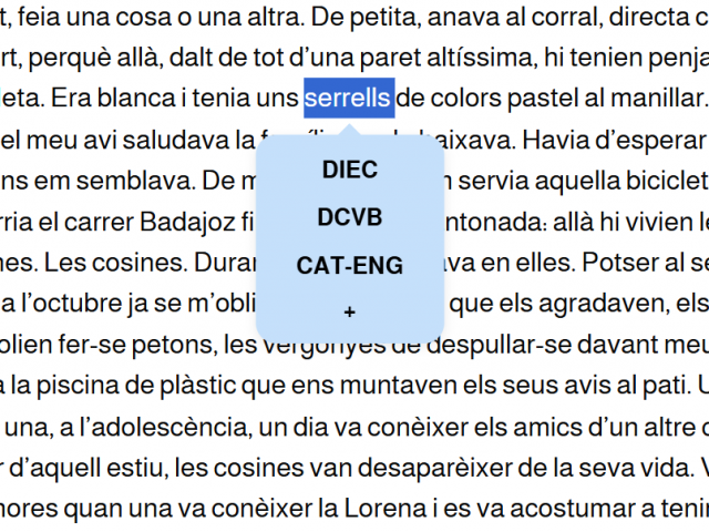 És per això que incorporem una nova funcionalitat: seleccionant qualsevol paraula d'un escrit de Catorze, es pot accedir amb un sol clic a la seva definició del DIEC (i el DEIEC, i el DDLC, i el Diccionari de sinònims Albert Jané, i el corpus textual informatitzat de la llengua catalana, tots cortesia de l'Institut d'Estudis Catalans), del Diccionari Català-Valencià-Balear Alcover Moll (gràcies a la feina de l'IEC i la Institució Borja Moll), del Diccionari Normatiu Valencià (de l'Acadèmia Valenciana de la Llengua), del Gran Diccionari de la Llengua Catalana (i la Gran Enciclopèdia Catalana i, per als més petits, el DIDAC, tots de Grup Enciclopèdia), del Viccionari de la Viquipèdia i d'eines com el Termcat, l'Optimot i el diccionari català-anglès de Softcatalà.