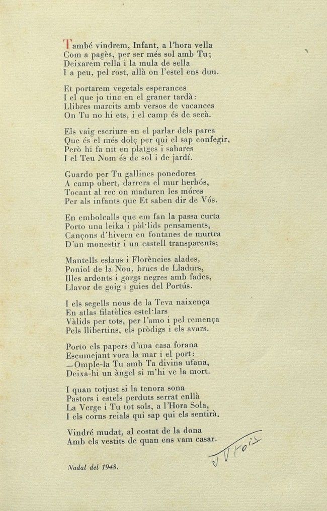 "El 7 de febrer del 1948 la seva dona va marxar de casa de manera completament inesperada, un abandonament que va representar per a Foix una ferida que mai no va acabar de tancar. I el 1947 havia publicat Sol, i de dol [...] un llibre que tothom va interpretar com un simple retorn als clàssics medievals. [...] Alguna cosa devia tenir a veure la «incomprensió» de la seva dona i la «incomprensió» literària del públic en el fet que iniciés la tramesa de nadales".