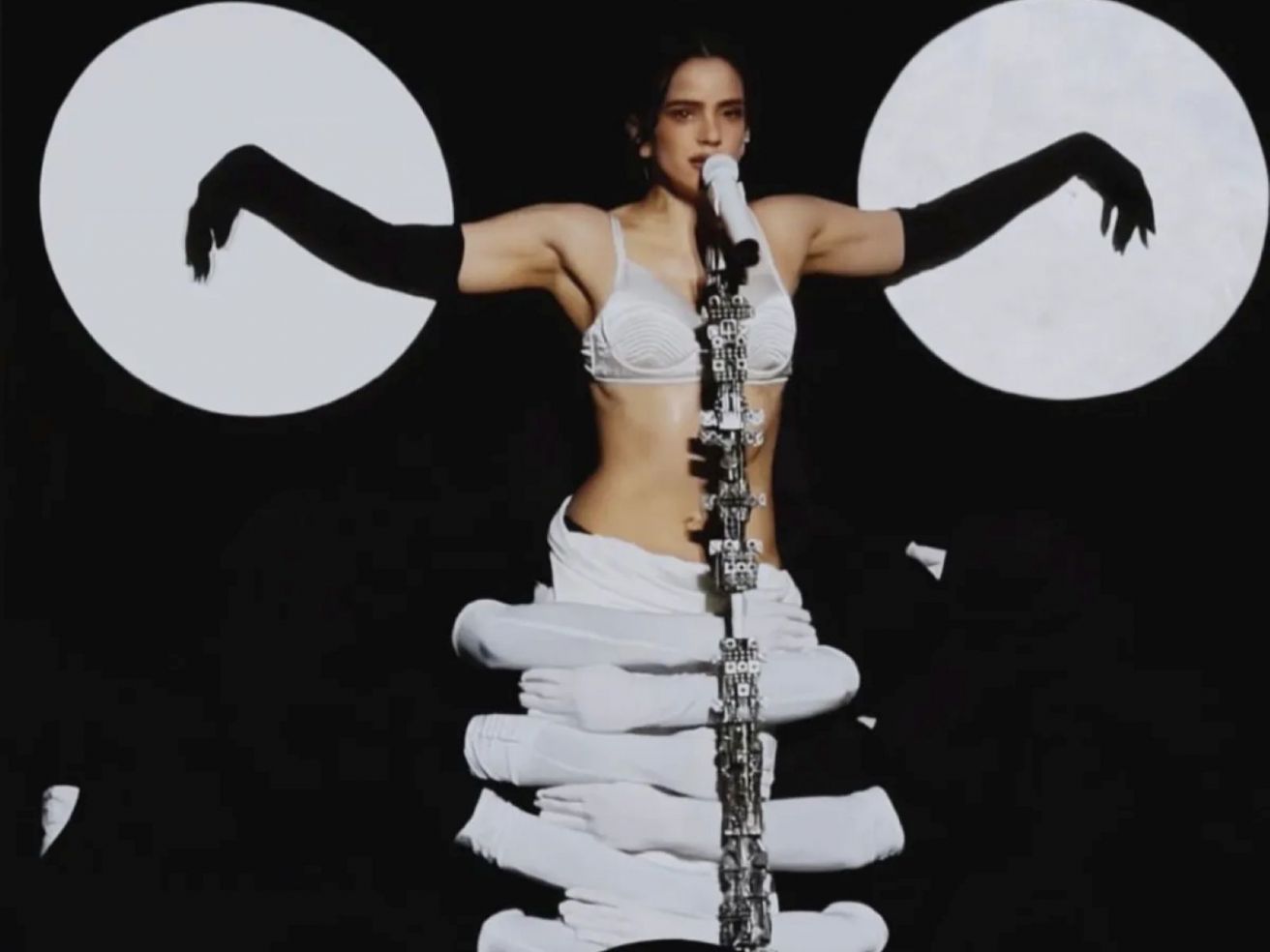 Rosalía ha estrenat la gira del seu nou disc, Lux, a Lió amb una proposta escènica de gran força visual. La coreografia, creada per Dimitris Papaioannou, explora el cos com si fos matèria escultòrica. Un dels moments més impactants del concert ha arribat amb La Perla: els guants blancs dels ballarins han envoltat la cantant, creant formes que evoquen icones com la Venus de Milo, Rita Hayworth a Gilda o figures d’imatgeria religiosa com la Mare de Déu de Lourdes.